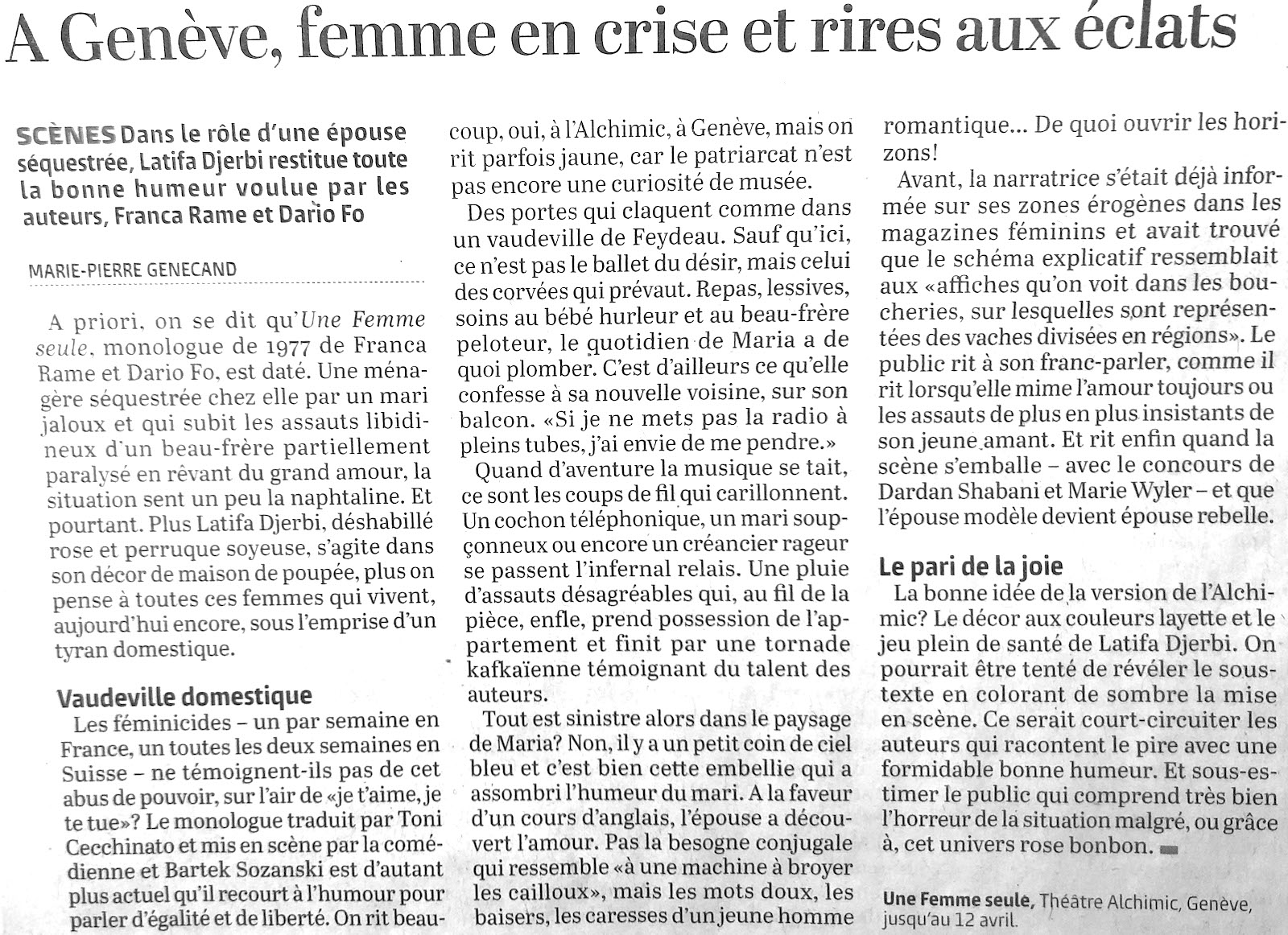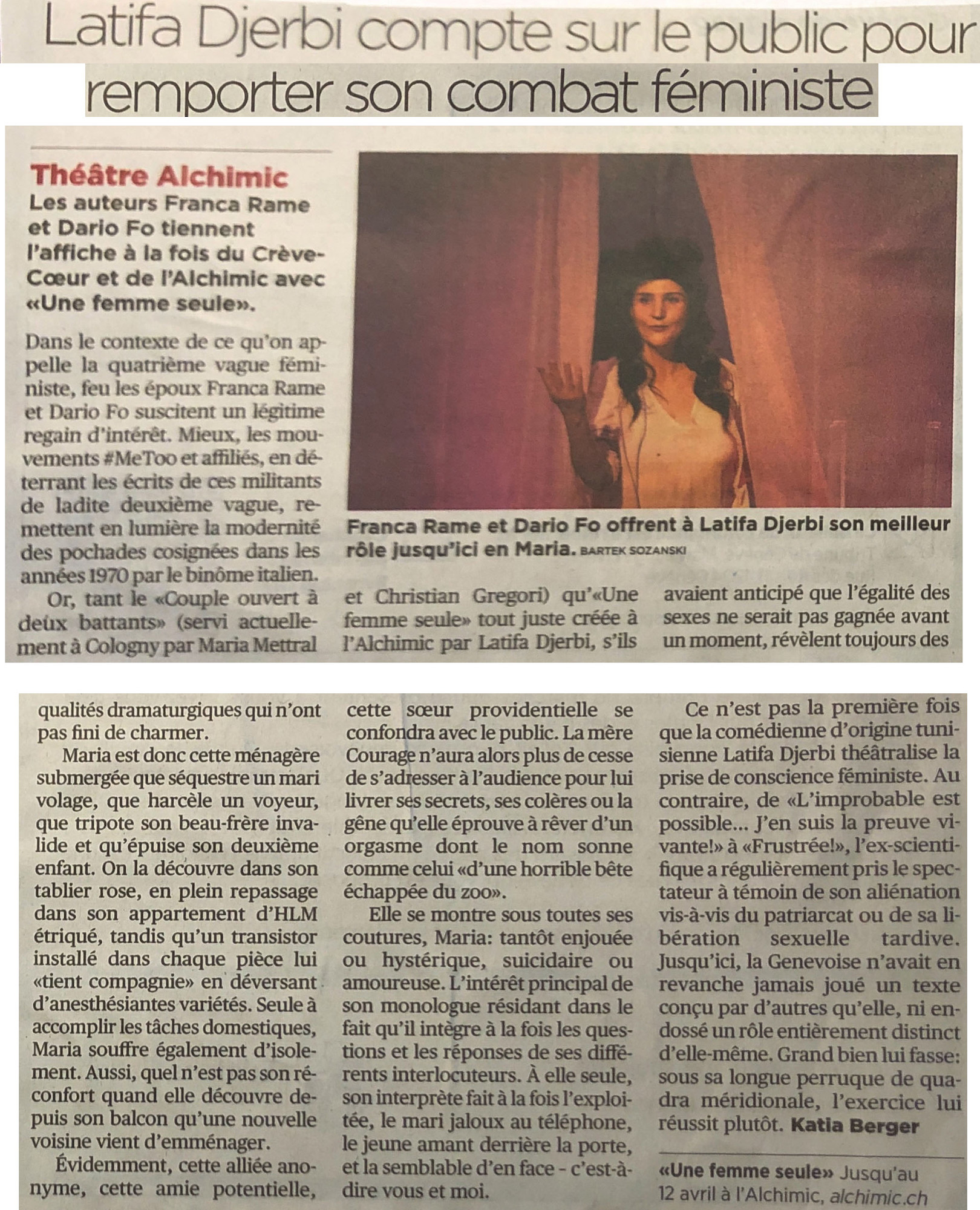 Tirée du recueil « Paroles de femmes » de Franca Rame et Dario Fo, Prix Nobel de littérature, « Une femme seule » est une comédie jubilatoire. Elle révèle les abus en tous genres que subit Maria, une mère au foyer enfermée à clef chaque matin par son mari jaloux avant qu’il ne parte au travail.